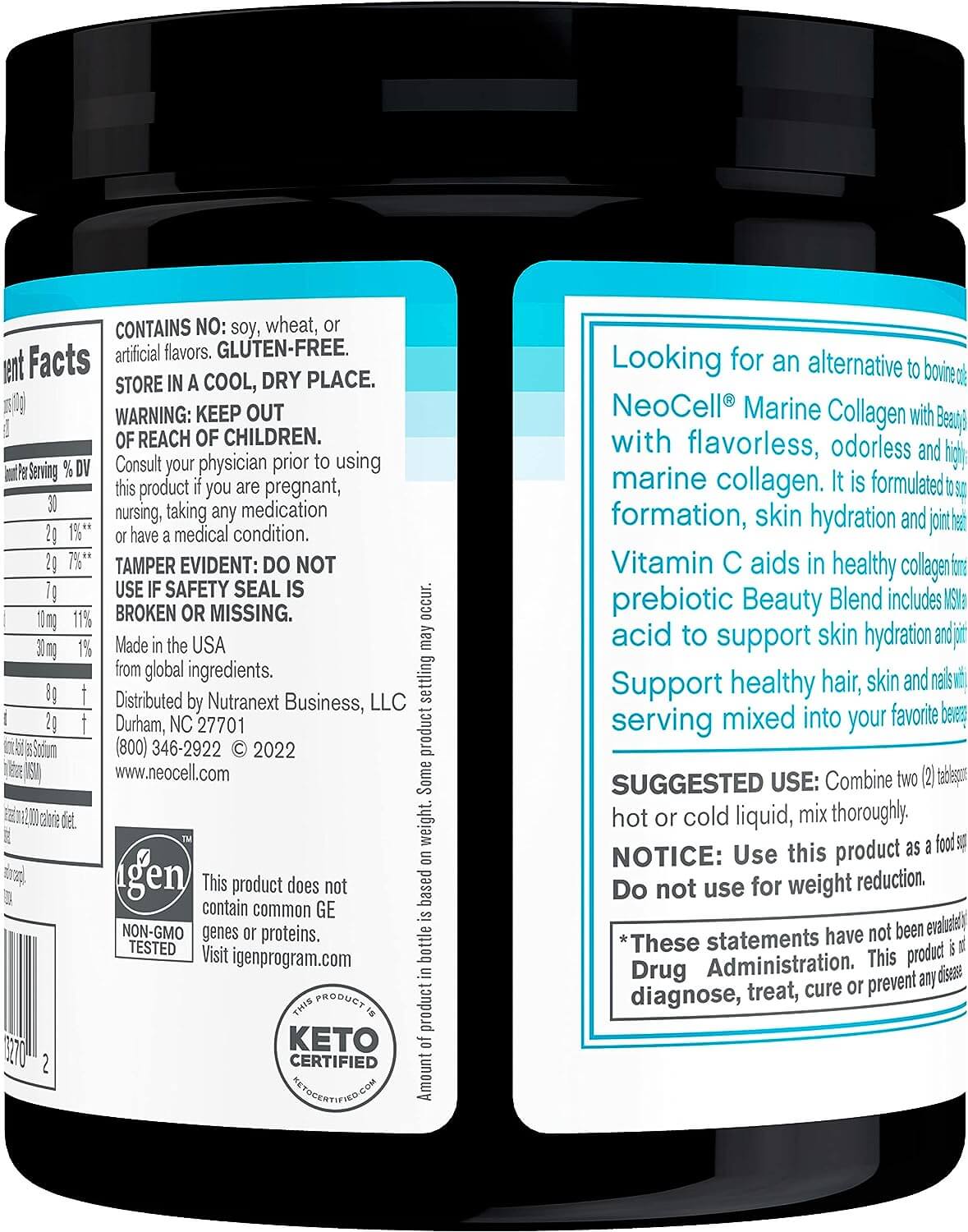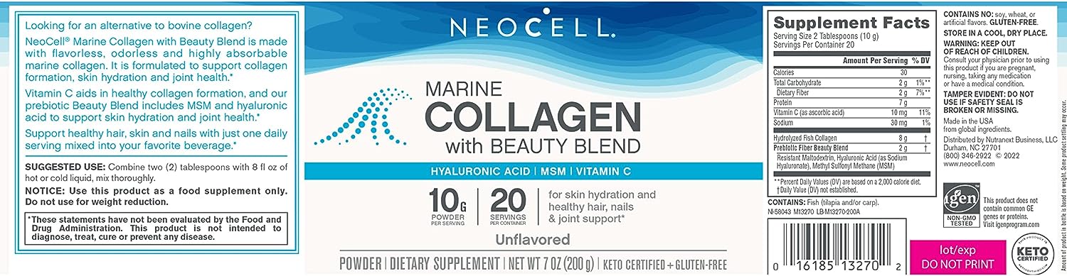 NEOCELL MARINE COLLAGEN مكمل الكولاجين الغذائي وهذا المنتج يحتوي على سائل مسحوق أو بودرة غير منكهة من الكولاجين بمقدار 7 أونصات بما يعادل 20 حصة ويتضمن هذا المنتج على الكولاجين البحري وهو شكل من أشكال البروتين المشتق من مصادر مختلفة من الأسماك البحرية منها قشور السمك والغضاريف والجلد وما إلى ذلك ويهتم الكولاجين البحري بدعم وتعزيز صحة الجلد والبشرة ويحارب الشيخوخة ويقضي على آثارها ويقوي الأظافر ولذلك فإننا سوف نلقي الضوء بالتفصيل على التعرف على أهمية هذا المنتج للجسم والجلد والشعر في هذا المقال.