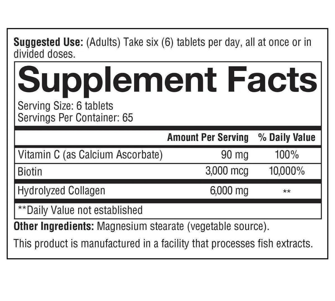 مكمل الكولاجين مع البيوتين يحتوي على أنواع الكولاجين 1 و 2 و 3، بينما يوفر 6 جرام (6000 مجم) من الكولاجين المتحلل لكل حصة ، بالإضافة إلى 100٪ من القيمة اليومية لفيتامين C و 3000 ميكروجرام من البيوتين – للمساعدة في تجديد الكولاجين داخل الجسم.