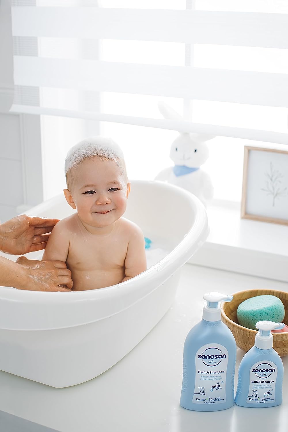 - حيث يعمل المنتج Sanosan Bath على تنظيف بشرة وجلد وشعر الأطفال الصغار والرضع.
