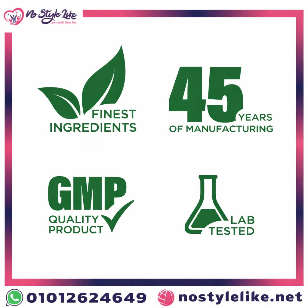 | الشكل الخارجي | زجاجة خضراء تحتوي على كبسولات نباتية مغلفة لسهولة البلع |