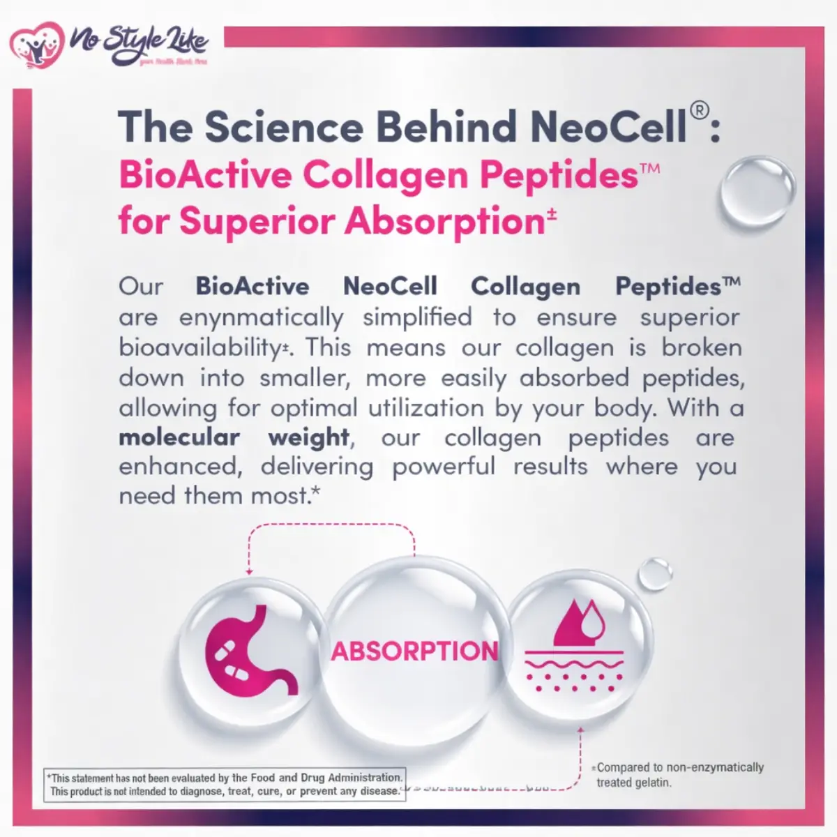 يعتمد NeoCell COLLAGEN BEAUTY BURSTS على كولاجين تم تكسيره إنزيميًا إلى ببتيدات صغيرة يسهل امتصاصها داخل الجسم.