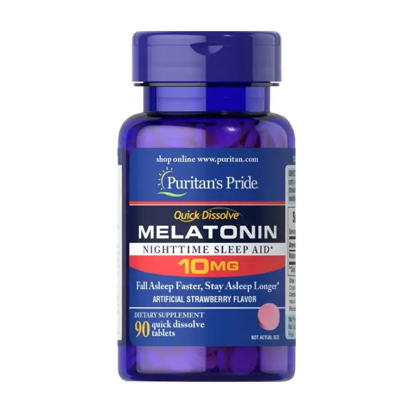 Puritan’s Pride Melatonin مكمل غذائي يحتوي على عدد 90 قرص سريع الذوبان بتركيز 10 مجم من مادة الميلاتونين بطعم الفراولة الصناعية وتكفي هذه العبوة مدة 3 شهور وهو منتج خال من الغلوتين والصويا ويعمل هذا المكمل الغذائي على المساعدة على تعزيز النوم المريح والقضاء على الأرق ويساعد على تحسين المزاج وذلك بفضل مادة الميلاتونين وهي العامل الرئيسي في مكونات هذا المنتج والميلاتونين هو عبارة عن هرمون يتم إفرازه في الغدة الصنوبرية في مخ الإنسان وتوجد مادة الميلاتونين في جميع خلايا الكائنات الحية؛ حيث يعمل هذا الهرمون على تنظيم الإيقاع الحيوي في البشر والحيوانات وفي هذا المقال سوف نلقي الضوء بالتفصيل على فوائد هذا المكمل الغذائي.