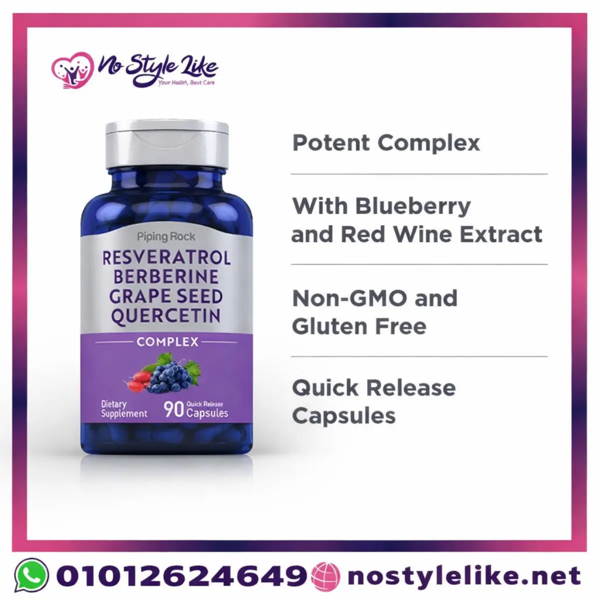 Piping Rock Resveratrol Berberine Grape Seed Quercetin Complex 900 mg 90 Caps | ريزفيراترول بيربرين خلاصة بذور العنب كيرسيتين 90 كبسولة 900 مجم مركب قوي للصحة الشاملة