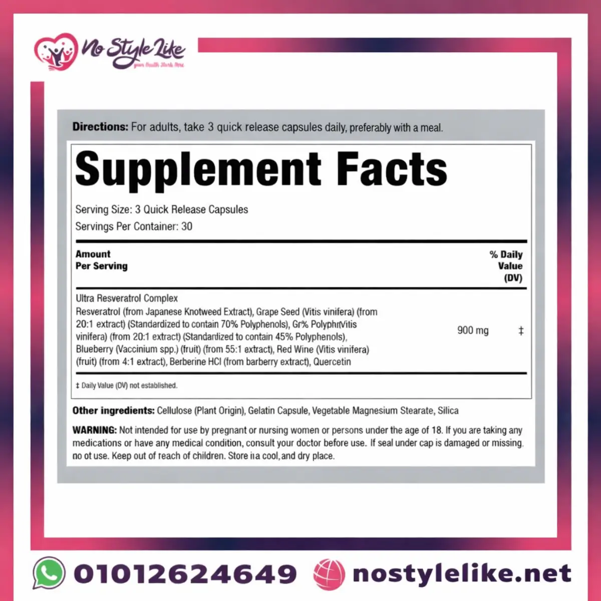 مكمل غذائي قوي يجمع بين الريسفيراترول، البربرين، مستخلص بذور العنب والكيرسيتين لدعم القلب، المناعة، وتنظيم السكر، بصيغة كبسولات سريعة الامتصاص.