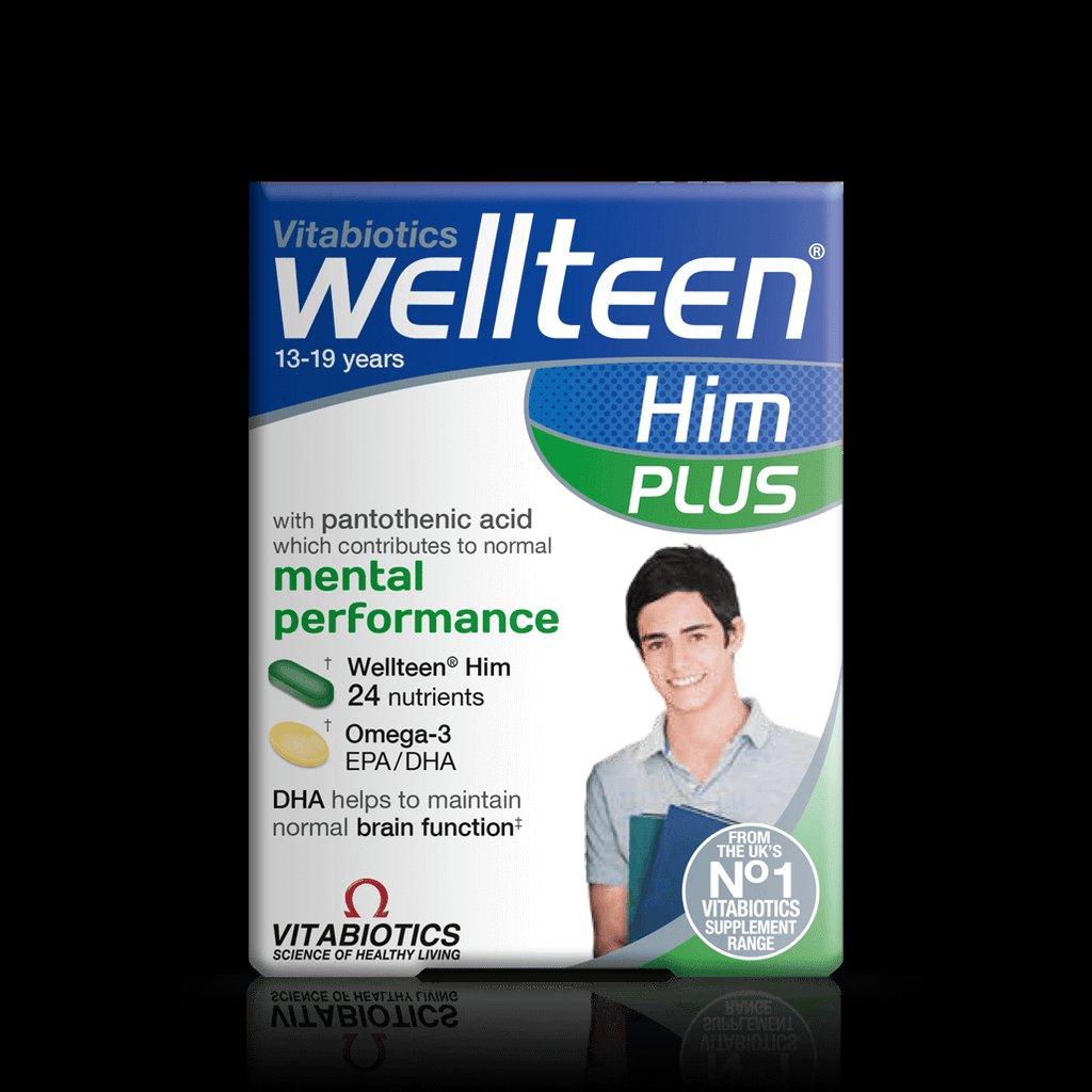 منتج Vitabiotics Wellteen Him Plus 56 Tablets, 13-19 years لزيادة التركيز وتحسين وظائف المخ لدي الصبيان المراهقين. حيث أنه وجدت دراسات أن المنتج يحسن من ممارسة الرياضة والحياة الاجتماعية المزدحمة لديهم.
